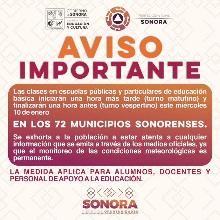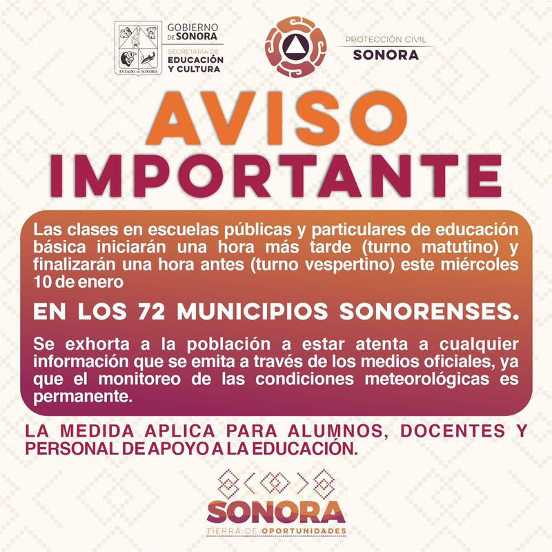 Para este miércoles 10 de enero, las clases en escuelas públicas y particulares de educación básica, de los 72 municipios sonorenses, se llevarán a cabo con el horario escolar modificado, anunció Aarón Grageda Bustamante.