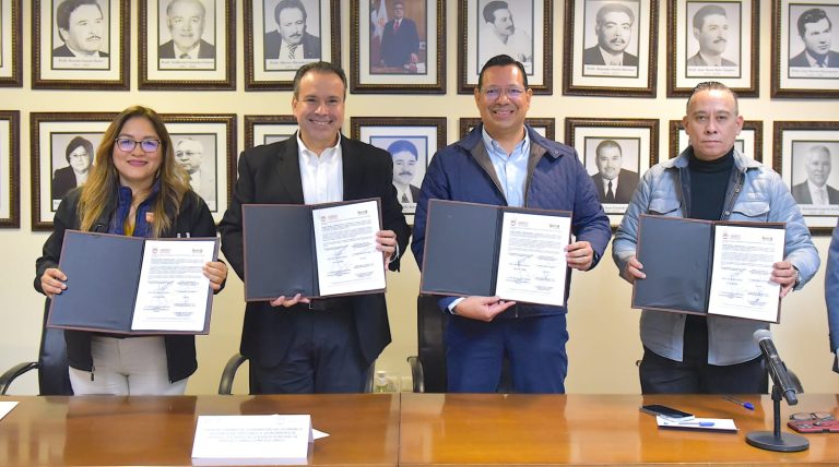 Junto a Carla Neudert Córdova, directora de la Agencia Municipal de Energía y Cambio Climático (AMECC), Toño Astiazarán firmó el acuerdo respectivo con Javier Ceballos Corral, Secretario General de la Sección 54 del SNTE.