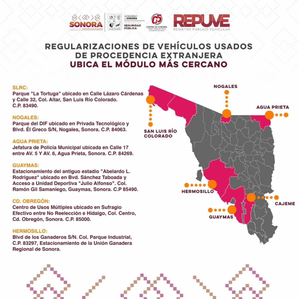 A partir del próximo 22 de enero el Registro Público Vehicular (Repuve) de Sonora, instalará módulos fijos para apoyar a la ciudadanía interesada en realizar el trámite de regularización de autos usados de procedencia extranjera en San Luis Río Colorado, Nogales, Agua Prieta, Guaymas y Cajeme anunció, la Secretaría de Seguridad Pública (SSP).