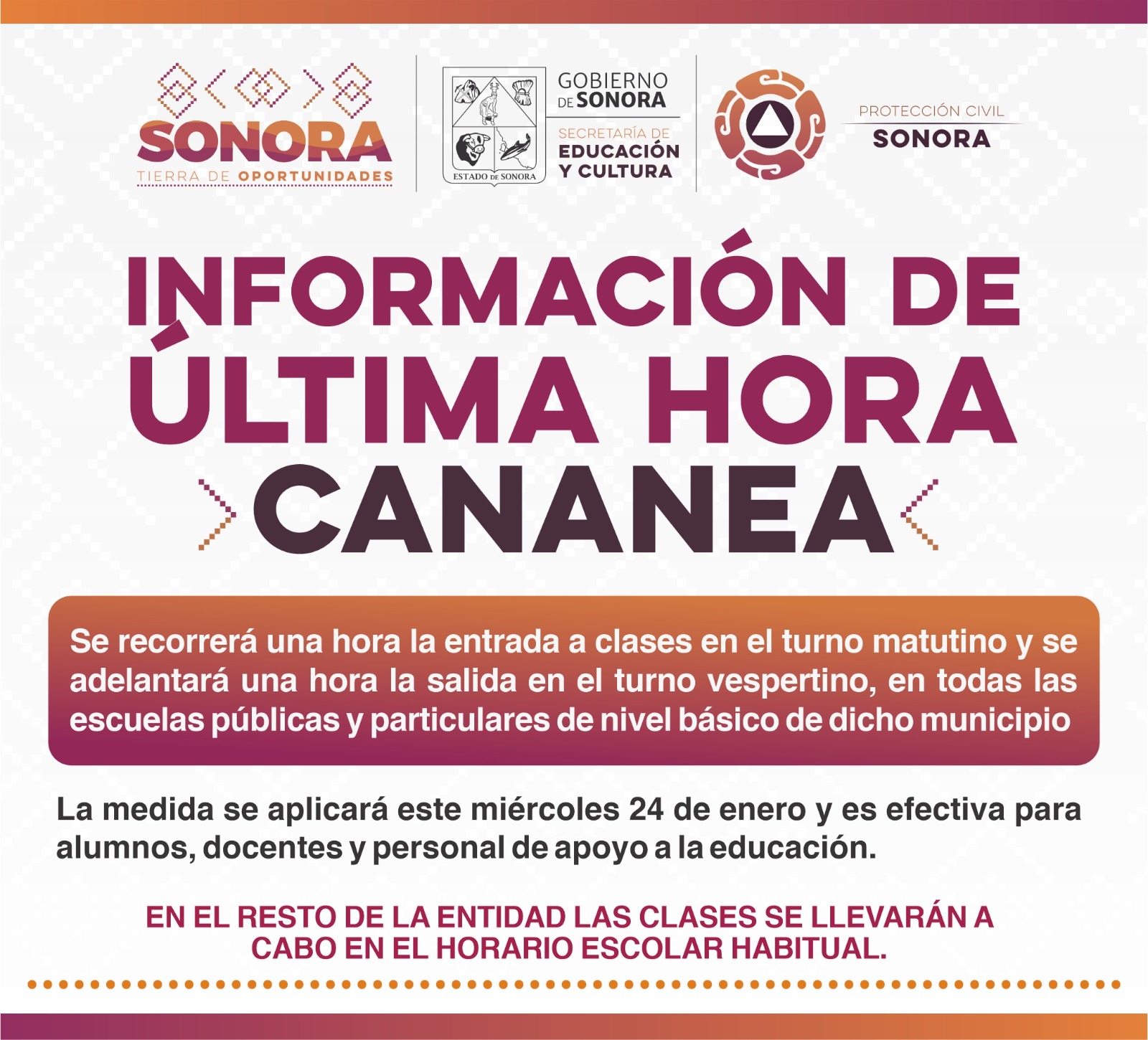 Con el objetivo de proteger la salud de la comunidad escolar, desde nivel elemental hasta secundaria, la totalidad de las escuelas de educación básica de Cananea entrarán a clases una hora más tarde en el turno matutino y saldrán una hora más temprano en el turno vespertino, anunció Aarón Grageda Bustamante.