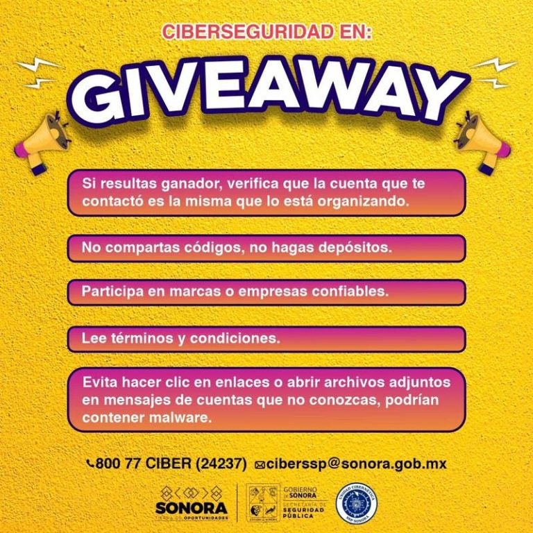 La Unidad Cibernética de la Secretaría de Seguridad Pública (SSP) de Sonora en cumplimiento a su labor preventiva, emitió recomendaciones para las y los ciudadanos que acostumbran participar en los denominados “Giveaway” a través de redes sociales para que no sean víctimas de delincuentes que realizan fraudes a través de estos concursos.