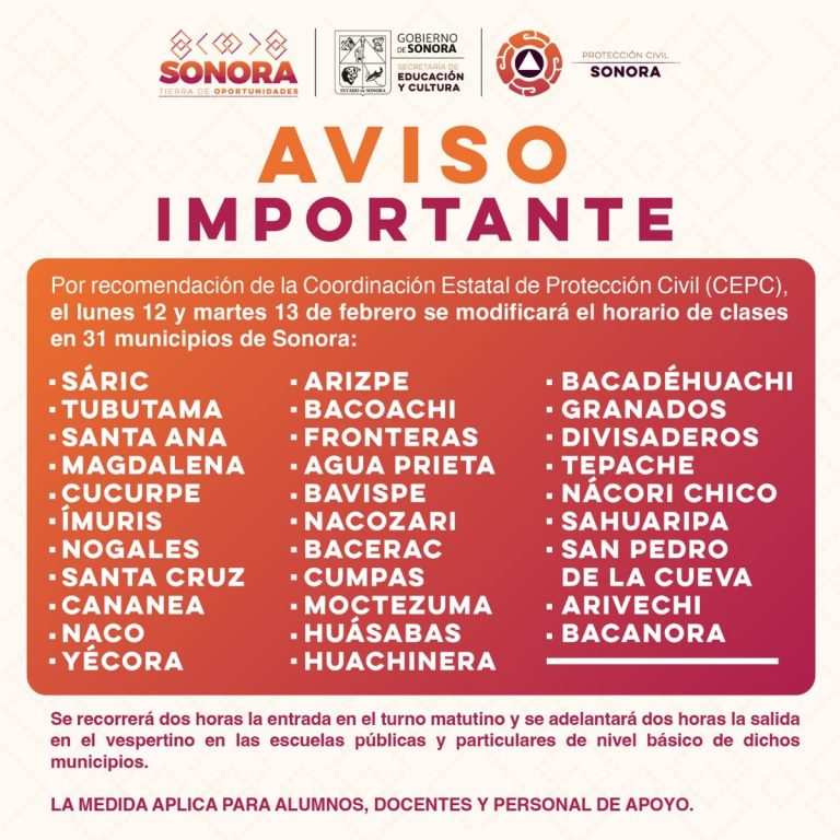 El titular de la Secretaría de Educación y Cultura (SEC) del Gobierno de Sonora, Aarón Grageda Bustamante, precisó que los municipios en los que se modificará el horario escolar son: Sáric, Tubutama, Santa Ana, Magdalena, Cucurpe, Ímuris, Nogales, Santa Cruz, Cananea, Naco, Yécora, Arizpe, Bacoachi y Fronteras.
