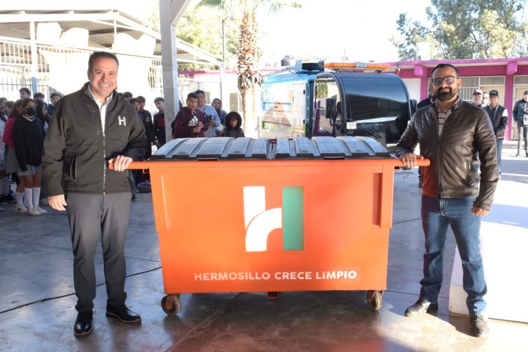 El Presidente Municipal Antonio Astiazarán Gutiérrez entregó a la comunidad de la secundaria 7, José María González, un contenedor para desechos de 1.5 metros cúbicos de capacidad, así como una estación para la separación de desperdicios aprovechables, como parte del programa RECICLASE.