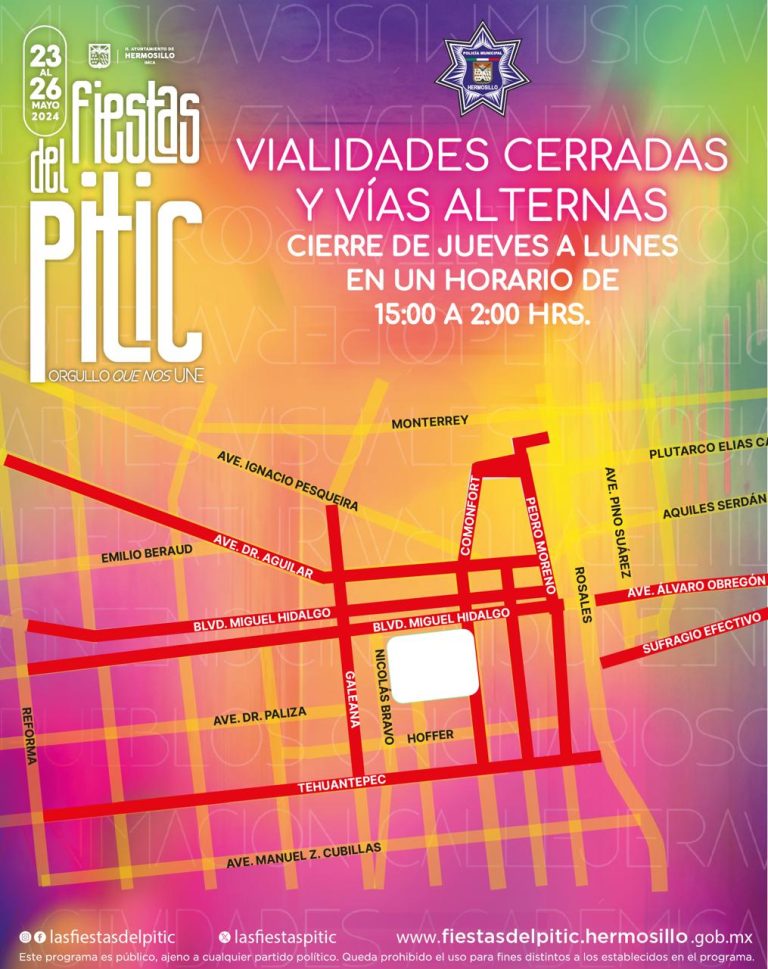 El Departamento de Tránsito Municipal exhorta a la ciudadanía a circular con precaución y hacer uso de vías alternas ante el cierre de vialidades durante el desarrollo de las Fiestas del Pitic 2024, que se llevarán a cabo del jueves 23 al domingo 26 de mayo.
