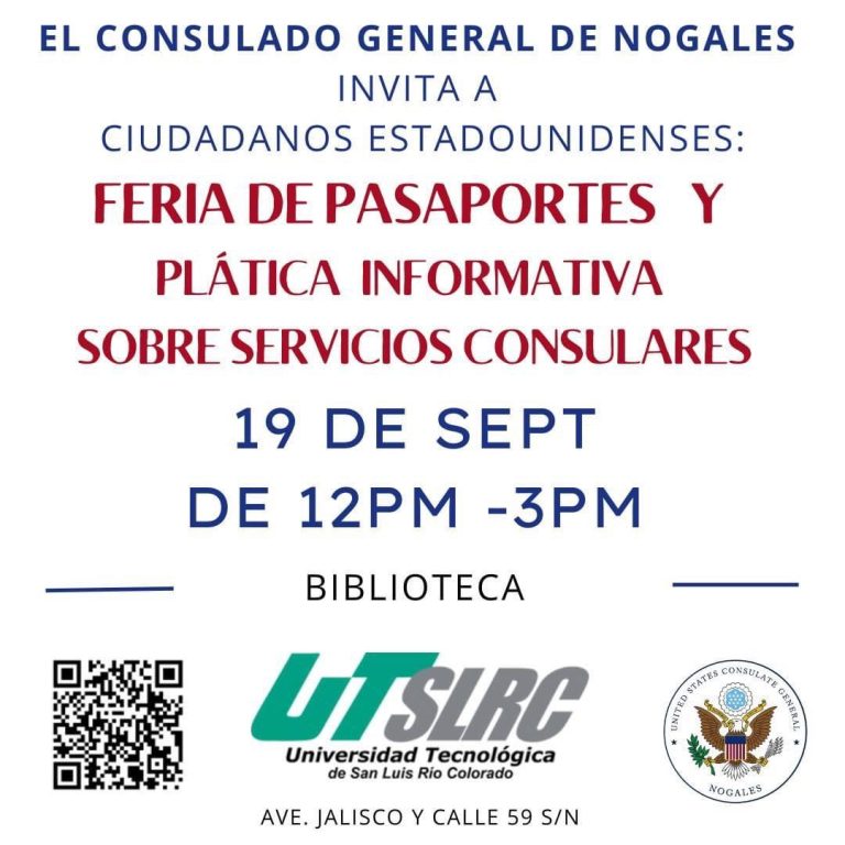 San Luis Río Colorado, Sonora; 17 de septiembre de 2024.- Ciudadanos estadounidenses en San Luis Río Colorado y San Luis, Arizona podrán recibir asistencia consular y renovar su pasaporte sin salir de la región, durante la Feria de Pasaportes organizada por el Consulado General de Estados Unidos en Nogales, en colaboración con la Universidad Tecnológica de San Luis Río Colorado (Utslrc).
