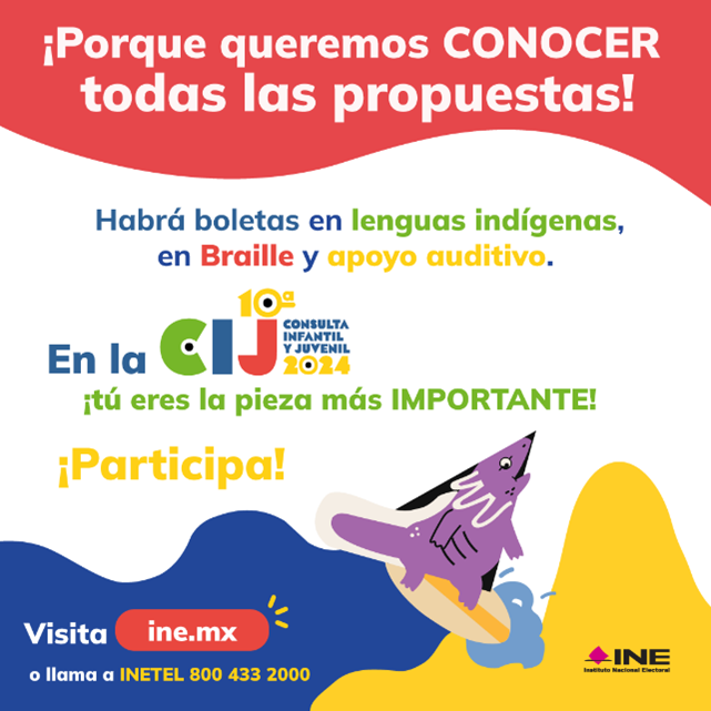Este 1 de noviembre, el Instituto Nacional Electoral (INE) dio inicio a la Consulta Infantil y Juvenil (CIJ) 2024, la cual convoca a todas las infancias y adolescencias entre 3 y 17 años para ejercer sus derechos a la participación y a la libre expresión, durante todo el mes de noviembre, sobre los temas que les interesan y les afectan directamente en su vida cotidiana.
