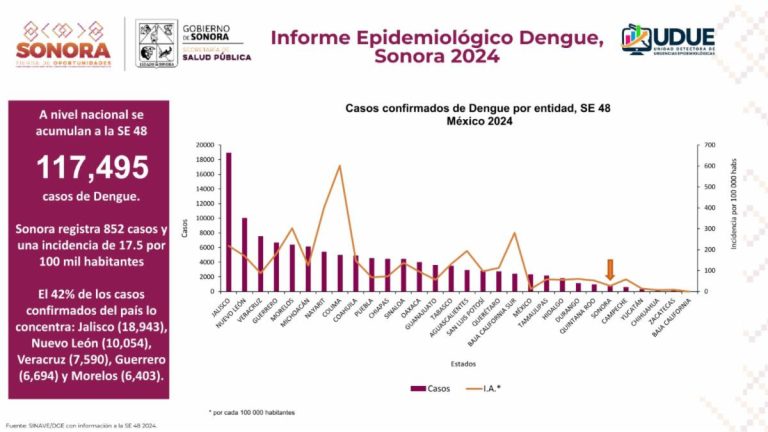 Sonora se sitúa en el lugar número 25 a nivel nacional por casos de dengue, pues en octubre se confirmaron 499, durante noviembre 201 y en lo que va de diciembre 12 casos, teniendo con esto un acumulado de 873 en lo que va del año 2024 y continuando con una disminución en casos positivos de la enfermedad en el estado, informó la Secretaría de Salud (SSP).