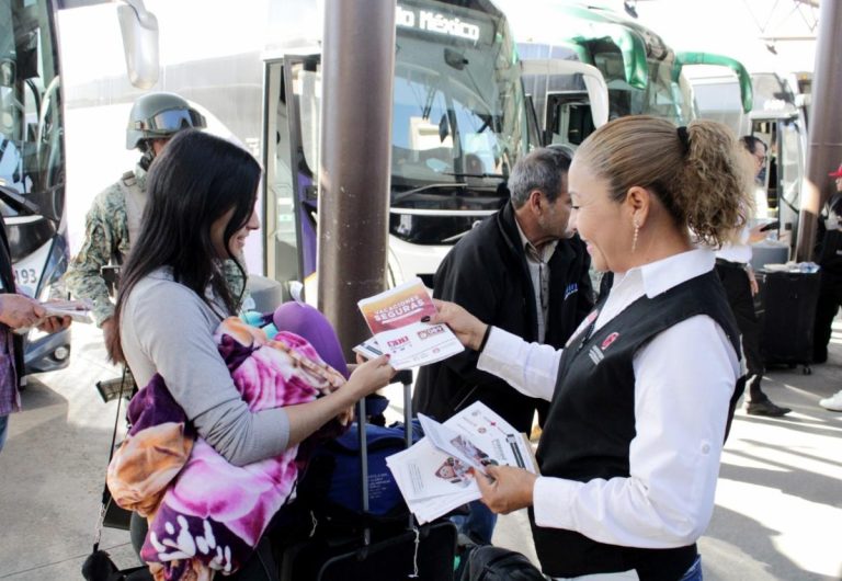Los equipos conformados por elementos de Policía Estatal de Seguridad Pública (PESP), personal del Centro Estatal de Prevención del Delito y Participación Ciudadana, así como del Centro de Control, Comando, Comunicación, Cómputo, Coordinación e Inteligencia (C5i) tienen presencia en las centrales para atender a las familias en su paso o arribo a Sonora.
