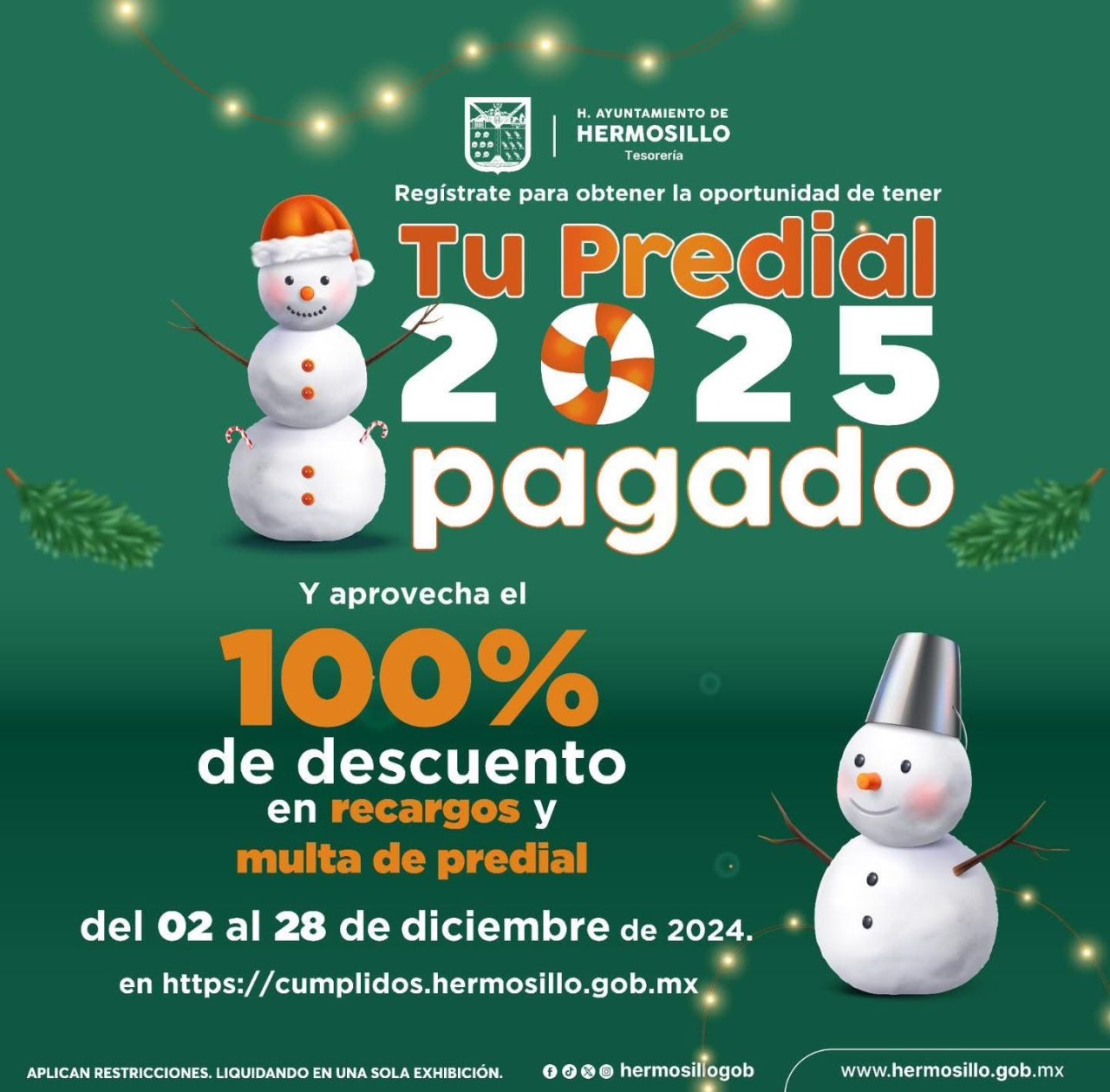 La directora de Ingresos de Tesorería Municipal del Ayuntamiento de Hermosillo, Yazmina Anaya Camargo, explicó que tienen hasta el 28 de diciembre para registrarse en la página www.cumplidos.hermosillo.gob.mx para participar en una selección aleatoria de beneficiarios del predial.