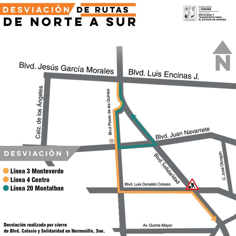 Línea 3 Monteverde y 4 Centro: transitando por el bulevar Solidaridad, al finalizar el Soriana Encinas vuelta a la derecha hasta el bulevar Paseo de las Quintas; de ahí, vuelta a la izquierda hasta llegar al bulevar Colosio, ahí virar a la izquierda hacia el bulevar Solidaridad para retomar su recorrido habitual.