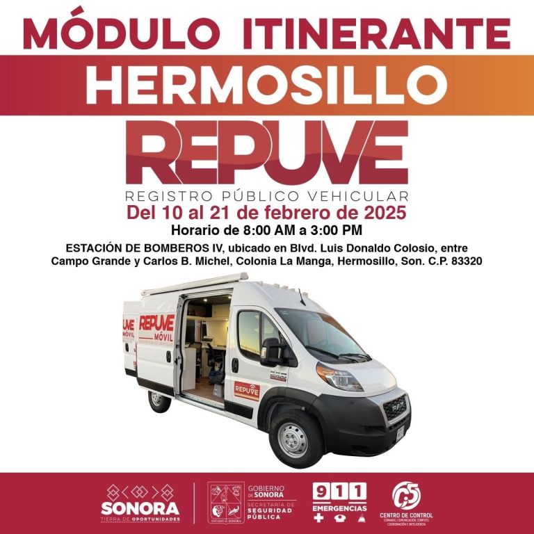 Del 10 al 21 de febrero estará el módulo itinerante del Registro Público Vehicular (Repuve) atendiendo en Hermosillo a todas las personas interesadas en regularizar autos usados de procedencia extranjera, informó la Secretaría de Seguridad Pública (SSP).