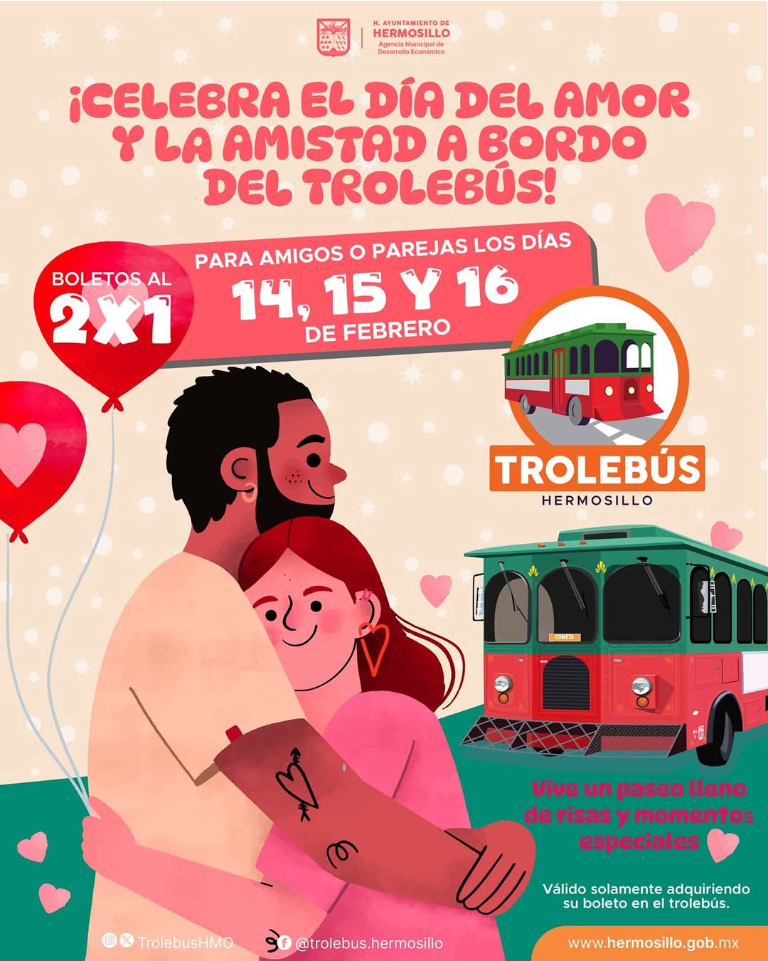 Este viernes 14, sábado 15 y domingo 16 de febrero adquiere tus boletos de Trolebús al 2×1 con la promoción del Día del Amor y la Amistad que el Ayuntamiento de Hermosillo ofrece para quienes deseen recorrer los lugares emblemáticos del municipio.
