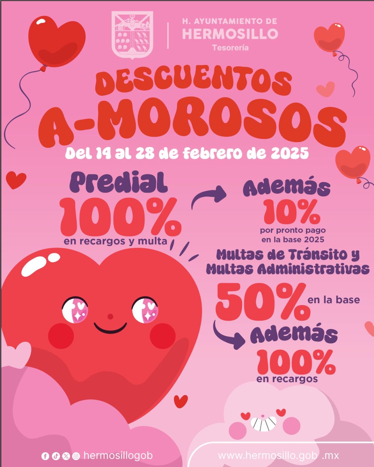 El Gobierno Municipal de Hermosillo, a través de Tesorería, lanzó la promoción Descuentos A-Morosos dirigido a contribuyentes que tienen adeudos y quieran aprovechar el descuento el 100 por ciento en los recargos y en las multas de predial, además del 50 en la base de multas administrativas y multas de tránsito.