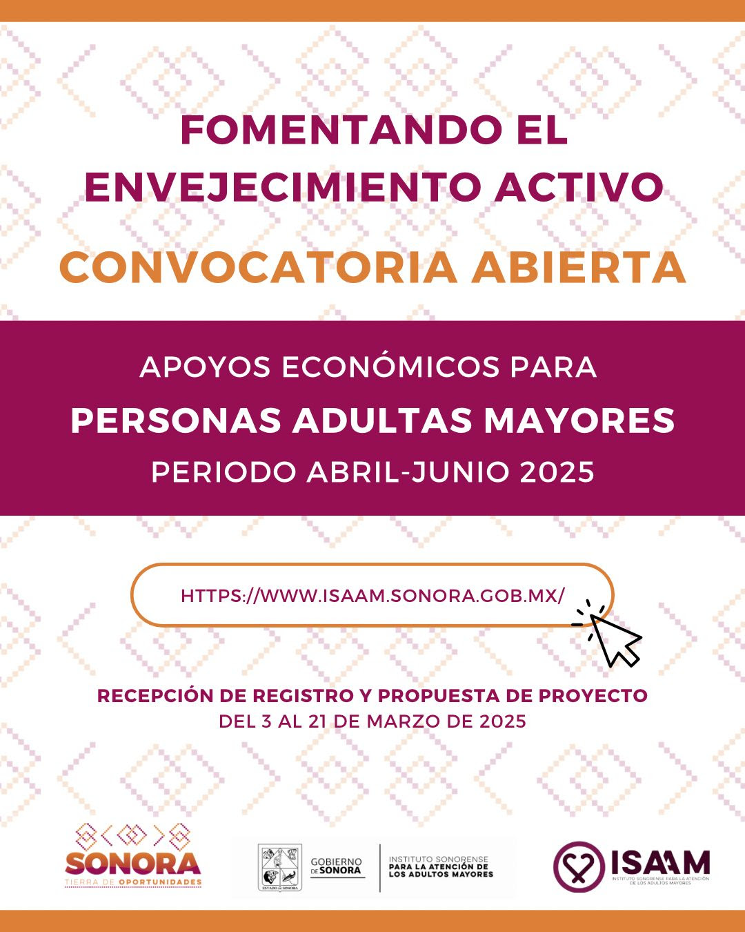 Con el firme compromiso de contribuir a superar la vulnerabilidad de las personas adultas mayores, a través del ejercicio de sus derechos y el impulso de sus oportunidades y habilidades, con actividades que les permita obtener un ingreso, mejorar su situación económica y calidad de vida, el Gobierno de Sonora, a través del Instituto Sonorense para la Atención de los Adultos Mayores (ISAAM), dio a conocer la primera Convocatoria de Fomentando el Envejecimiento Activo 2025.