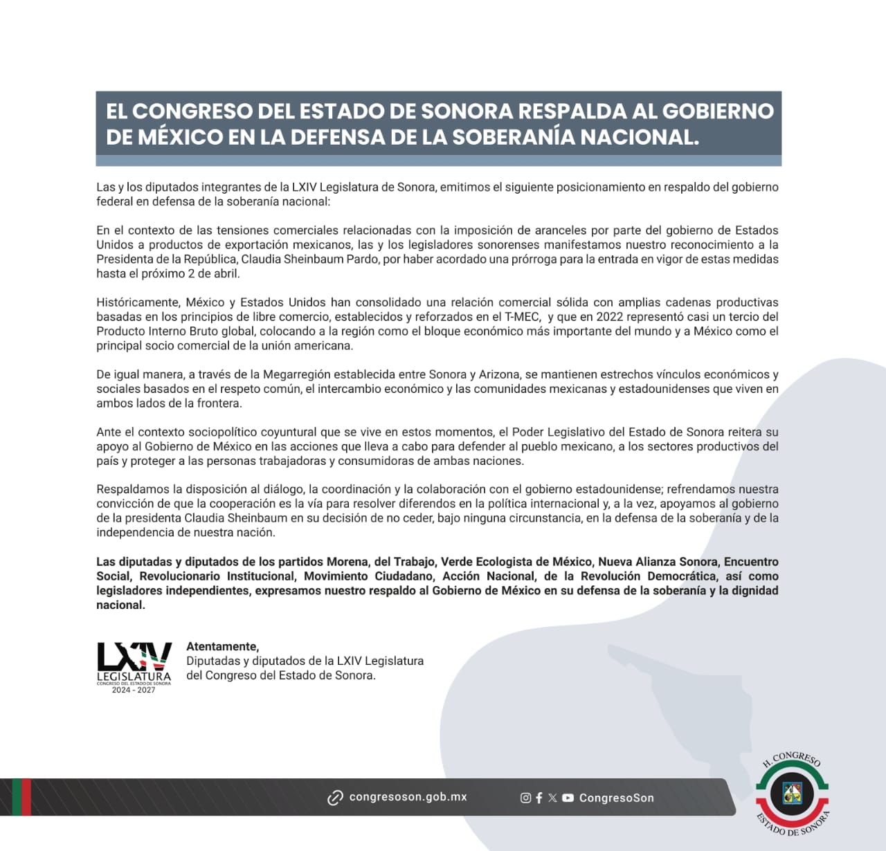 Las diputadas y diputados de los partidos Morena, del Trabajo, Verde Ecologista de México, Nueva Alianza Sonora, Encuentro Social, Revolucionario Institucional, Movimiento Ciudadano, Acción Nacional, de la Revolución Democrática, así como legisladores independientes, reiteraron su aval al gobierno federal en su disposición al diálogo, la coordinación y la colaboración con el gobierno estadounidense;  su convicción de que la cooperación es la vía para resolver diferendos en la política internacional y, a la vez, el apoyo a la presidenta Claudia Sheinbaum de no ceder, bajo ninguna circunstancia, en la defensa de la soberanía y de la independencia de la nación.