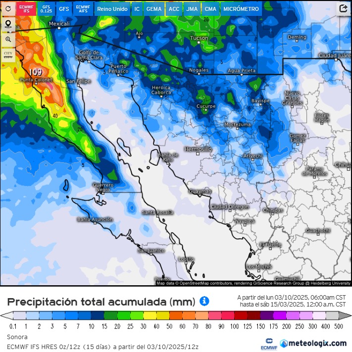 Se espera que este sistema pudiera dejar acumulados de lluvias de 10 a 20mm sobre el noroeste y norte la madrugada del día miércoles. Así mismo, rachas de viento con velocidades que pudieran superar los 50 km/h. A su vez, se considera la probabilidad de caída de nieve y aguanieve sobre la zona montañosa del norte.
