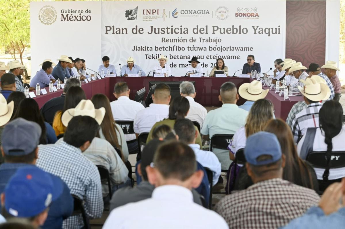 Vícam, municipio de Guaymas, Sonora; 24 de marzo de 2025.- Como parte del compromiso del Gobierno de Sonora y el respaldo de la presidenta Claudia Sheinbaum Pardo al Plan de Justicia para el Pueblo Yaqui, el gobernador Alfonso Durazo Montaño sostuvo una reunión con las autoridades tradicionales yaquis y la Comisión Jiaki del Agua para dar seguimiento a las acciones en materia de suministro de agua y el desarrollo de la comunidad.