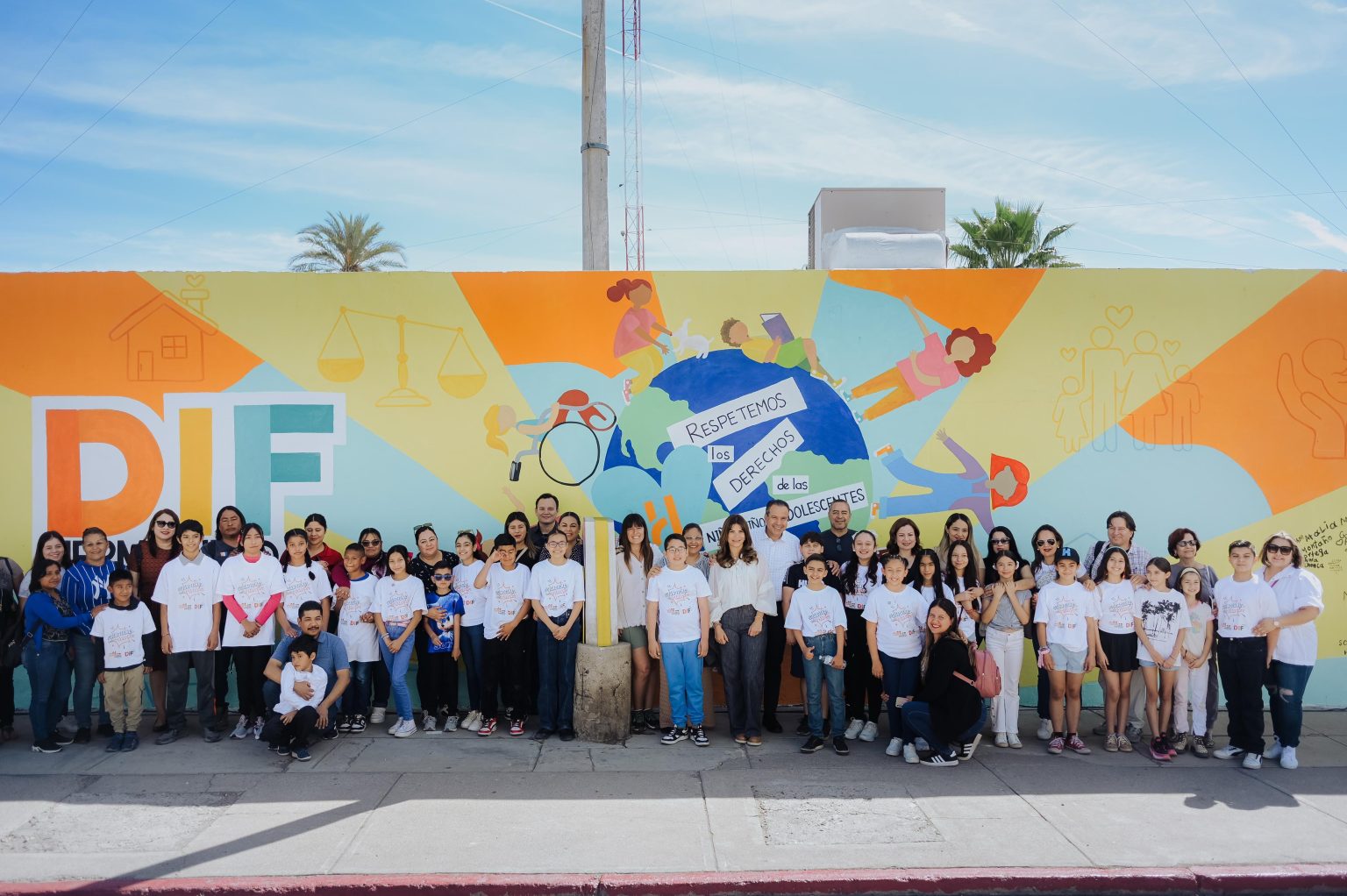 Acompañados por Madeleine Bonnafoux, directora de DIF Hermosillo atestiguaron la creatividad e imaginación de Cabildo Infantil quienes transformaron la pared del sistema integral en un colorido lienzo que refleja la importancia de los derechos de la niñez en el mundo.