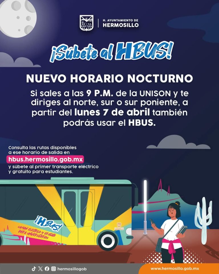 En atención a estudiantes de la Universidad de Sonora el HBus iniciará este lunes 7 de abril el nuevo horario nocturno para el norte, sur y sur poniente de la ciudad
