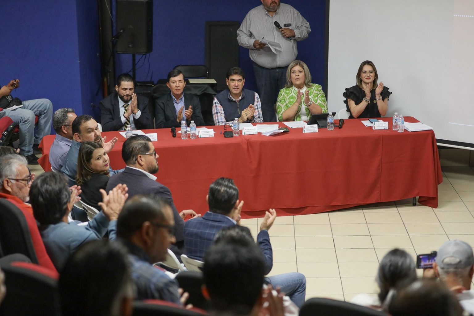 El diputado Hector Castelo Montaño (Morena) dio la bienvenida a las y los asistentes, acompañado de Juan Francisco Gim Nogales, alcalde del municipio; la diputada Azalia Guevara Espinoza (PVEM); Amanda Marchena, directora estatal de Asuntos Religiosos; y Rodolfo Bañuelos, coordinador de Asuntos Religiosos del municipio.