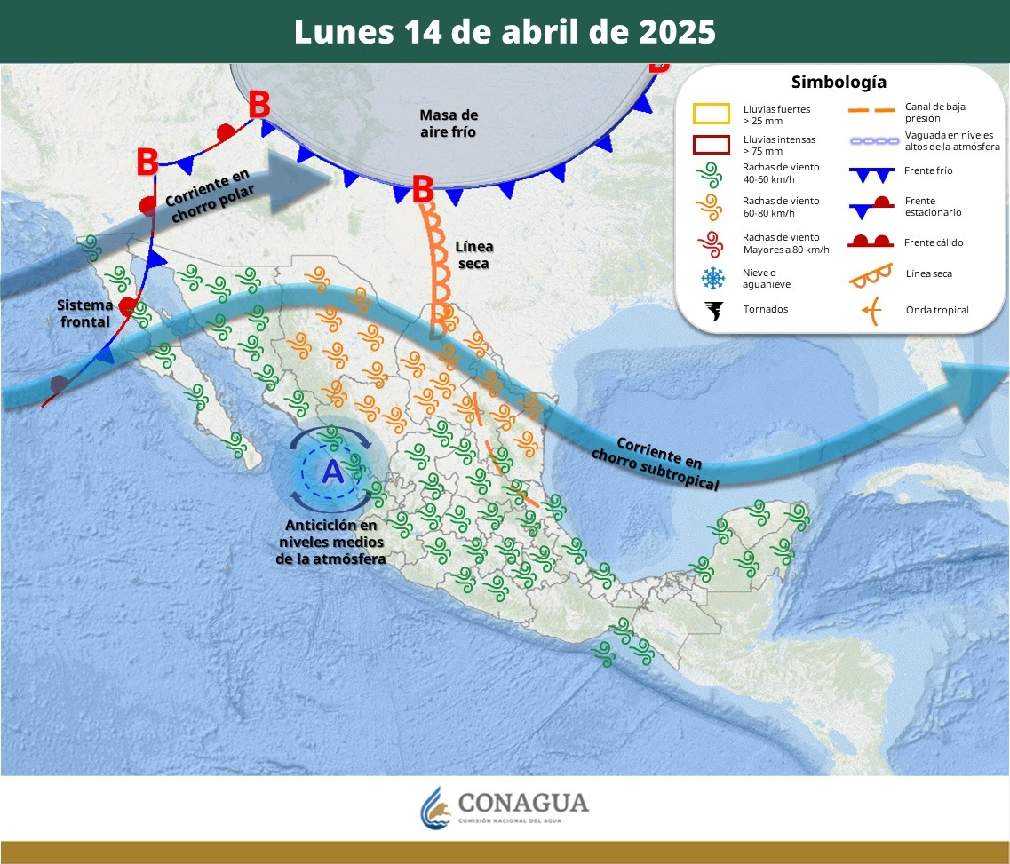 De acuerdo con los modelos meteorológicos, durante la noche del domingo 13 y la madrugada del lunes 14 de abril, un nuevo frente frío ingresará por la frontera noroeste de Sonora. Este sistema, en interacción con las corrientes en chorro polar y subtropical, favorecerá una disminución en las altas temperaturas que se han registrado recientemente.