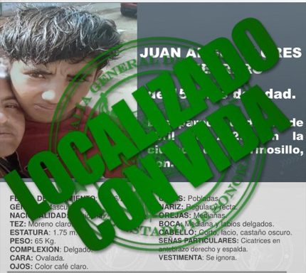 La Fiscalía General de Justicia del Estado de Sonora (FGJES), a través de la Agencia Ministerial de Investigación Criminal (AMIC), informa que fue localizado con vida Juan Ángel “N”, de 15 años, quien contaba con reporte de desaparición, denuncia formal y alerta activa del Protocolo Amber.