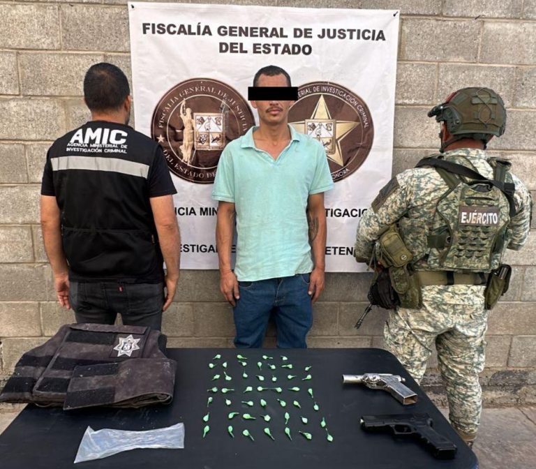 Además, se ubicó en el inmueble un arma de fuego hechiza, una réplica de arma de fuego tipo Glock y un chaleco balístico con las insignias de una corporación de seguridad pública, indicios que junto con el detenido fueron puestos a disposición del Ministerio Público para las diligencias legales correspondientes.