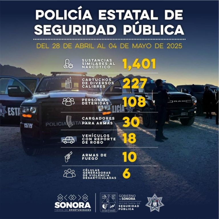 Como resultado del trabajo permanente de combate y prevención del delito en los municipios, la Secretaría de Seguridad Pública (SSP) realizó operativos en los que fueron detenidas 108 personas, entre ellas integrantes de seis células generadoras de violencia, además del aseguramiento de diversos objetos y sustancias ilícitas en diferentes municipios de Sonora.