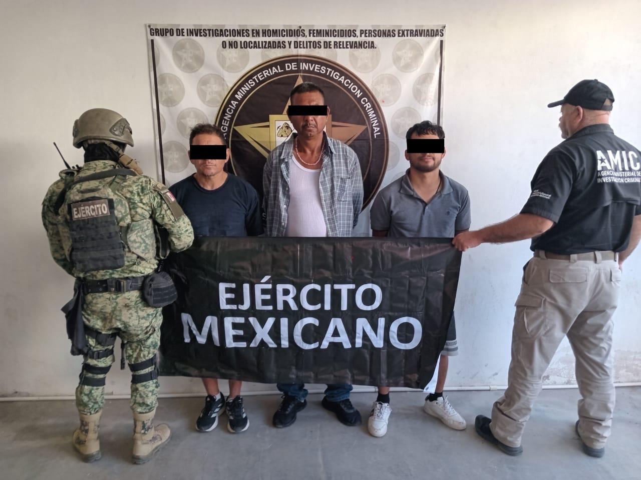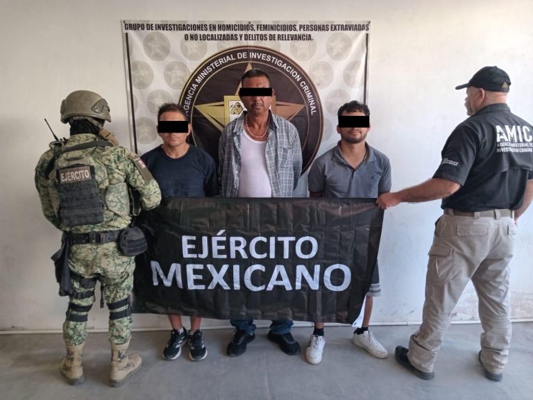 El operativo se efectuó en un domicilio correspondiente a la colonia La Huerta de Caborca, Sonora, sitio donde se logró la captura de Alán “N”, de 28 años y Luis Gerardo “N”, de 48 años, además de José Luis “N”, de 45 años, quien cuenta con antecedentes por homicidio culposo, fraude genérico y narcomenudeo.