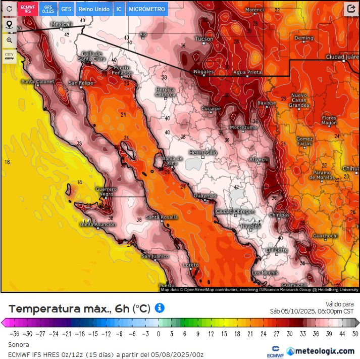 Durante hoy y el próximo fin de semana, se prevé un aumento considerable en las temperaturas máximas, teniendo un ambiente de caluroso a muy caluroso con temperaturas diurnas que oscilen entre los 35 a los 43°C sobre el noroeste, norte, centro, oriente y sur pudiendo registrar valores mayores en distintos puntos. Asimismo, se mantendrán condiciones estables dando paso a cielos mayormente despejados sin probabilidad de lluvia durante el fin de semana.