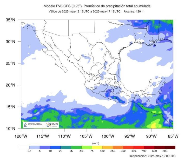 Por otro lado, no se prevén precipitaciones sobre el estado de Sonora durante el resto de la semana. Asimismo, no se espera actividad ciclónica sobre el Pacifico Oriental durante las próximas 48 horas.