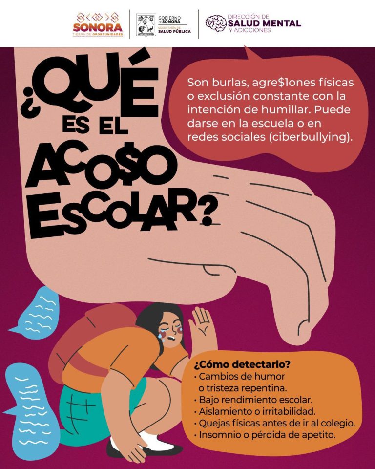 Con el objetivo de proteger el bienestar emocional y físico de niñas, niños y adolescentes, la Secretaría de Salud de Sonora (SSP) hace un llamado a madres, padres de familia y tutores a prevenir y detectar oportunamente el acoso escolar, fenómeno que se presenta tanto en planteles educativos como en redes sociales.