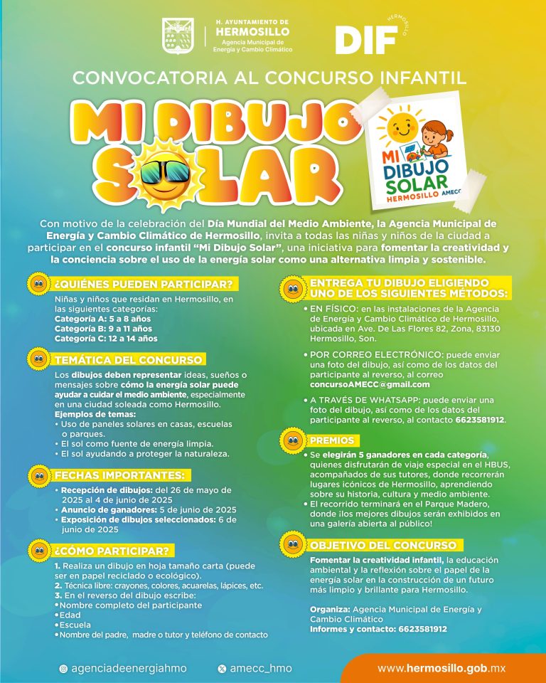 A fin de incentivar a las niñas y niños de la localidad para que expresen gráficamente sus ideas y sueños sobre cómo la energía del sol puede ayudar a mejorar el medio ambiente, el Ayuntamiento de Hermosillo lanzó la convocatoria al concurso infantil “Mi Dibujo Solar”, informó Carla Neudert Córdova, directora de la Agencia Municipal de Energía y Cambio Climático, AMECC.