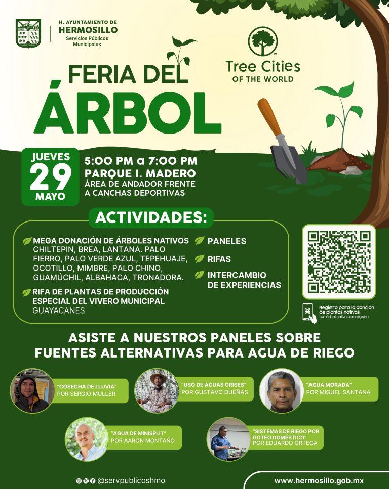 Una invitación a sumarse a la Feria del Árbol extendió el Ayuntamiento de Hermosillo este jueves 29 de mayo de 5:00 a 7:00 de la tarde en el Parque Madero donde se llevará a cabo una celebración especial con donaciones de especies nativas y charlas enriquecedoras sobre el cuidado del entorno.