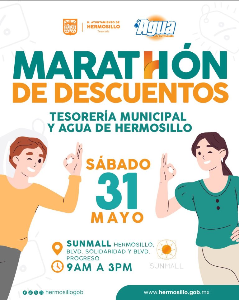 Tesorería Municipal invita a aprovechar los beneficios del “Doble Marathón de Descuentos” del Ayuntamiento de Hermosillo que se realizará este sábado 31 de mayo en SunMall de bulevar Progreso y Centro de Atención Veracruz de la colonia San Benito.