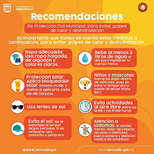 Ante las altas temperaturas previstas para este fin de semana, la Coordinación Municipal de Protección Civil (CMPC) emitió recomendaciones para prevenir golpes de calor y deshidratación y junto a la Dirección de Participación Ciudadana desplegará personal en distintos sectores de Hermosillo para reforzar acciones preventivas y brindar apoyo a la ciudadanía.