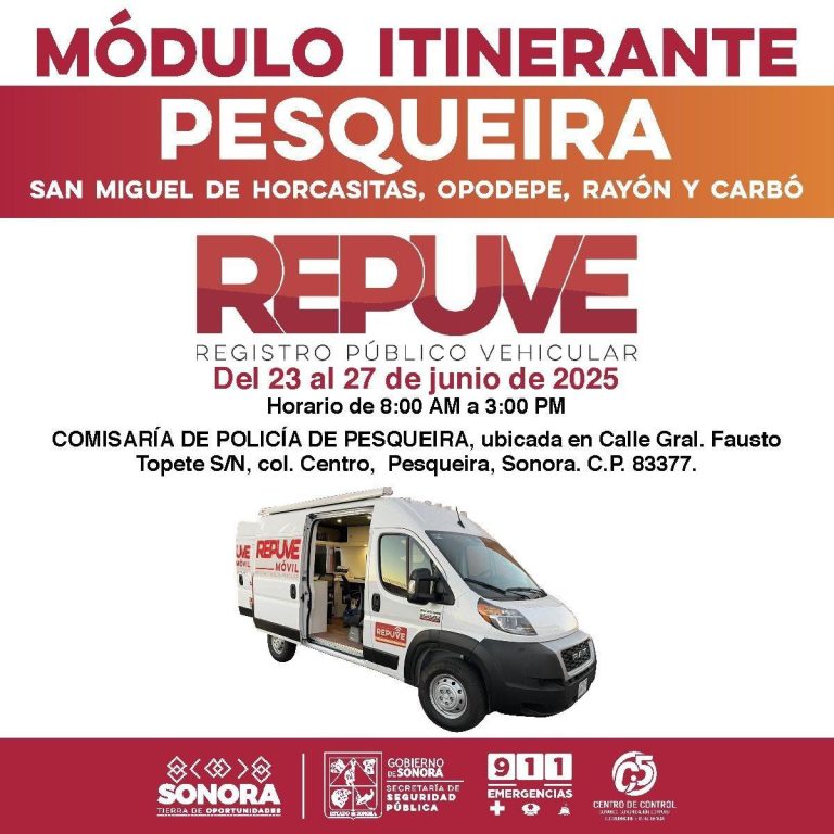 Del 23 al 27 de junio, la unidad móvil se instalará frente a la Comisaría de Policía de Pesqueira, ubicada en la calle General Fausto Topete, sin número, en la colonia Centro, en un horario de 8:00 a 15:00 horas.