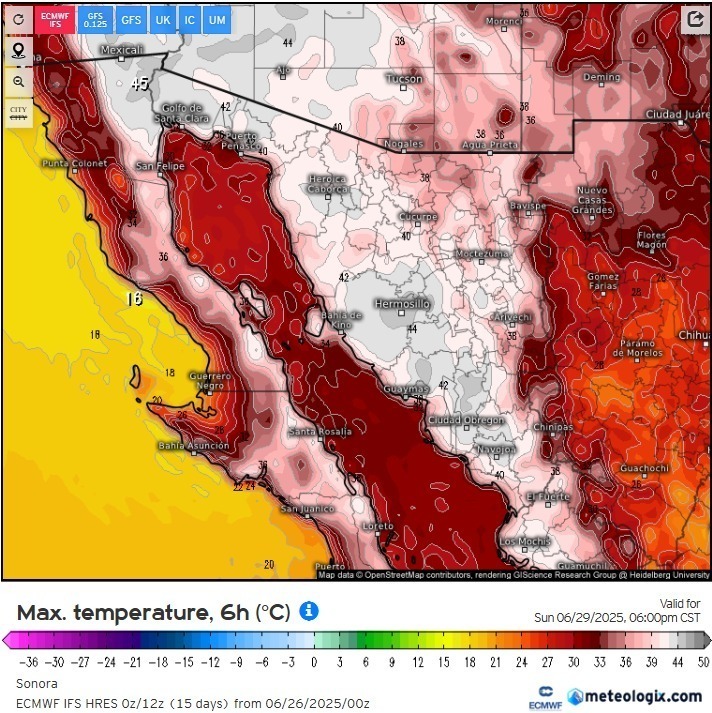 En las regiones noroeste, centro y sur del estado se pronostican valores máximos que oscilarán entre los 43 y 46 °C, e incluso superiores en algunos puntos. Aunado a esto, una considerable cantidad de humedad en el ambiente provocará sensaciones térmicas más elevadas.
