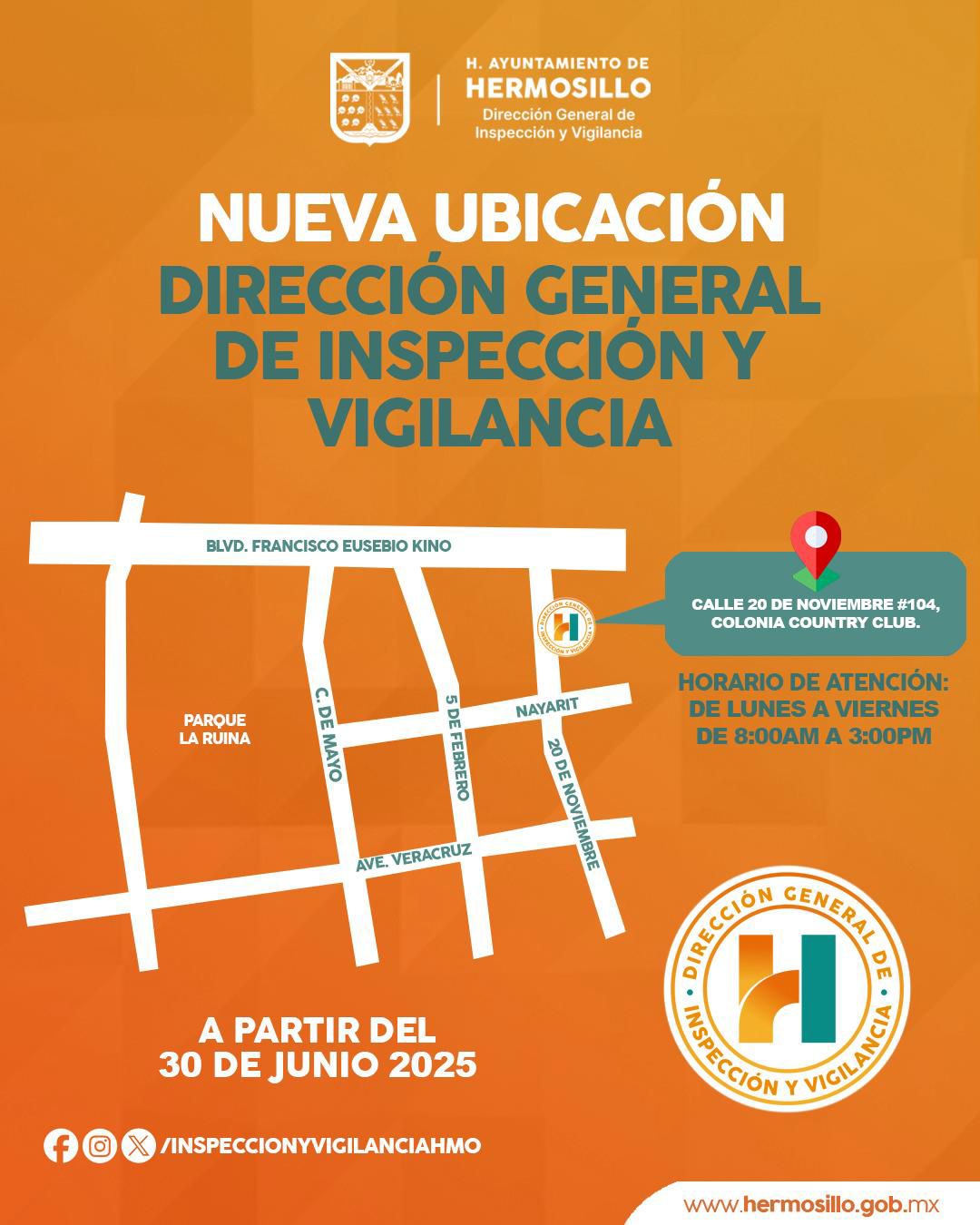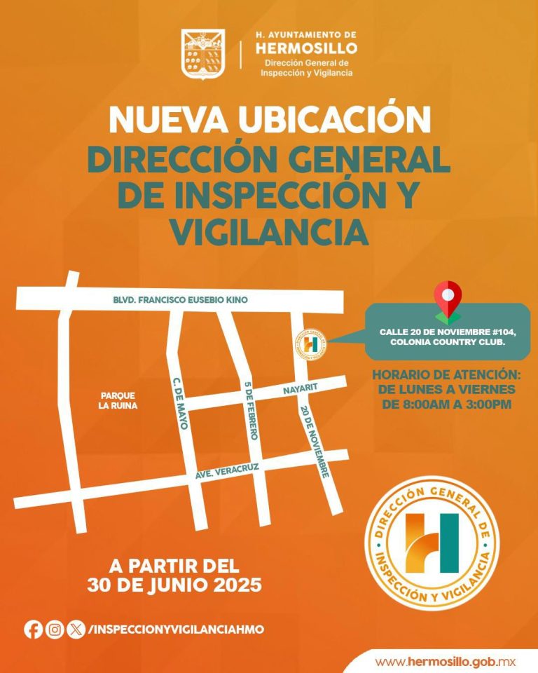 La Dirección General de Inspección y Vigilancia del Ayuntamiento de Hermosillo contará con una nueva ubicación a partir de este lunes 30 de junio, informó la titular Lisette López.