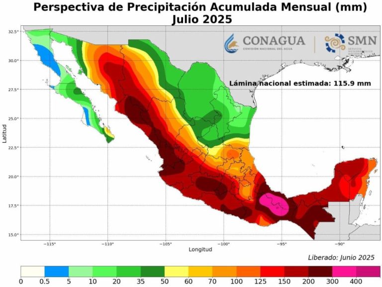 De acuerdo con el pronóstico, durante julio se mantendrán condiciones favorables para precipitaciones, con alta probabilidad de superar la media registrada en años anteriores. Incluso, se contempla que julio podría ser el mes con mayor acumulación de lluvias en lo que va del año.