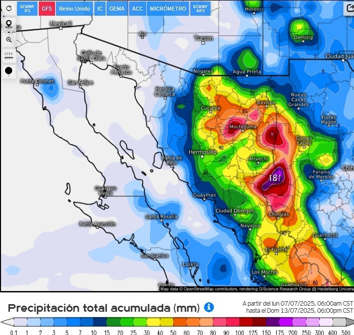 Respecto a las lluvias, el pronóstico semanal prevé precipitaciones significativas (de 50 a 75 mm), como parte del patrón climático tipo monzón que afecta a la región serrana y al río Sonora, con una posible trayectoria hacia el centro del estado. No obstante, la mayor concentración de eventos de precipitación se presentará en la región serrana, en municipios limítrofes con Chihuahua.