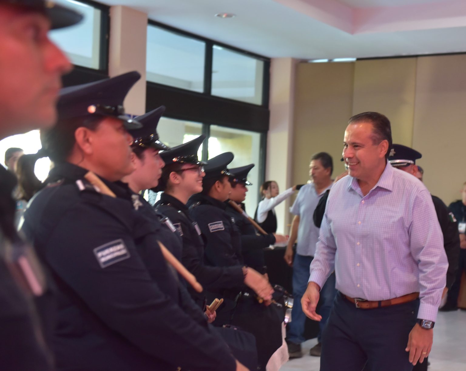 Lo acompañaron en el presídium José Guadalupe Martínez Lavariega, Comisario General de la Policía Estatal de Seguridad Pública; Luis Fernando Ramírez Salcido, Comisario Jefe de la corporación municipal; y Aurelio Orlando Cuevas Ramos, regidor presidente de la Comisión de Seguridad Pública del Cabildo, así como integrantes del gabinete municipal y regidores.