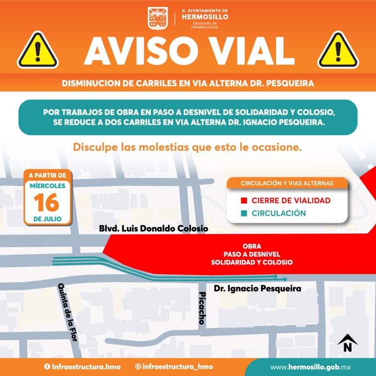 La Dirección General de Desarrollo de Infraestructura emitió en días pasados un aviso vial al respecto, con la recomendación a quienes transiten por el lugar, de que extremen precauciones y atiendan la señalización preventiva como parte de las adecuaciones viales necesarias por el proceso constructivo del paso a desnivel de los bulevares Colosio y Solidaridad.