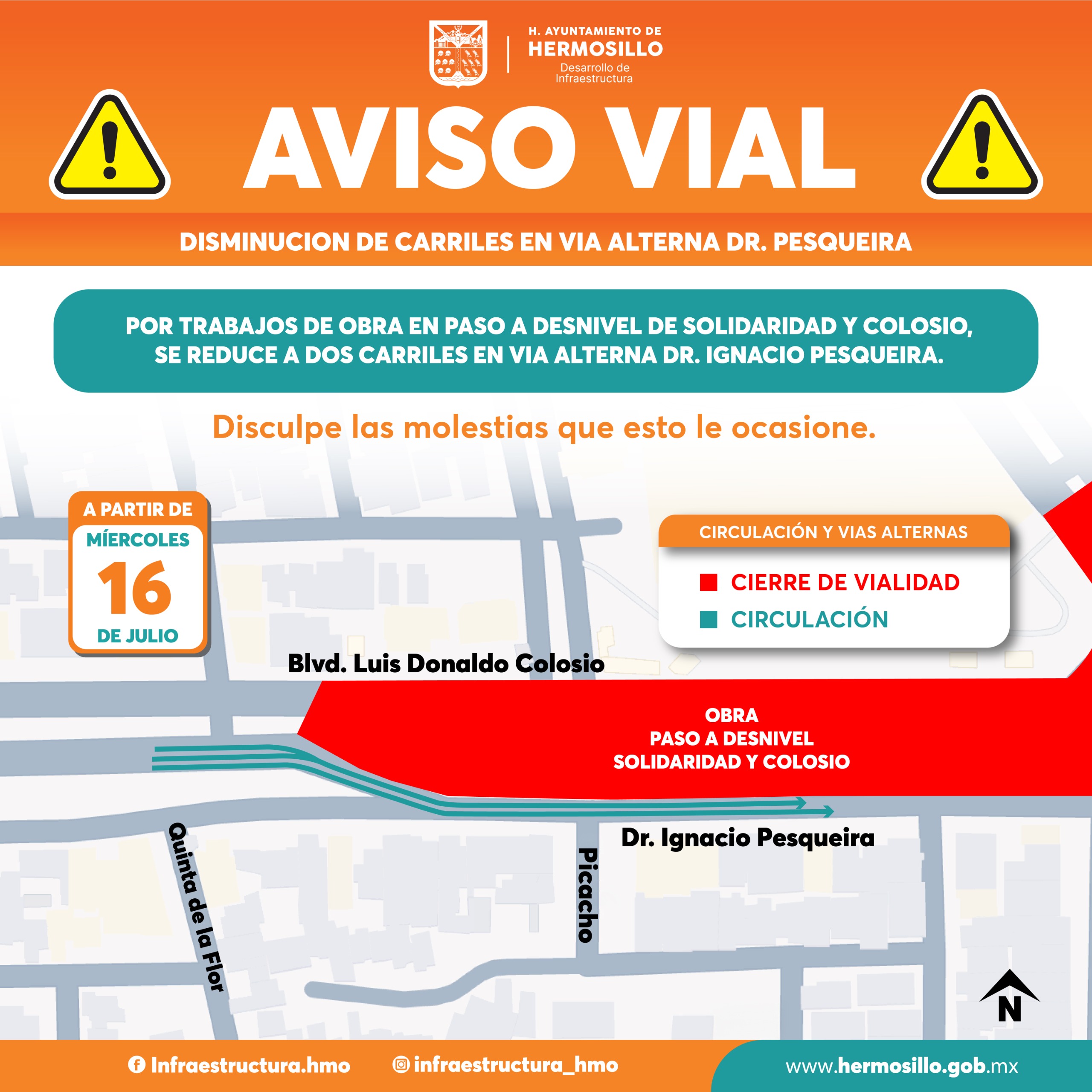 El Ayuntamiento de Hermosillo, a través de la Dirección de Desarrollo de Infraestructura, reitera el llamado a automovilistas a tomar precauciones en la reducción de tres a dos los carriles de circulación de poniente a oriente en la calle Doctor Pesqueira.