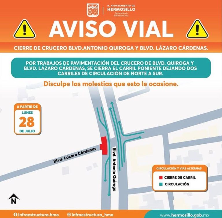 Debido al inicio de los trabajos de pavimentación con concreto hidráulico del cruce de los bulevares Quiroga y Lázaro Cárdenas, se cerrará el carril poniente a partir del lunes 28 de julio.