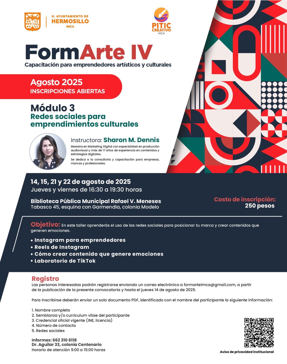 El Ayuntamiento de Hermosillo, a través del Instituto Municipal de Cultura y Arte (IMCA) invita a artistas, emprendedores y gestores culturales a participar en el módulo “Redes sociales para emprendimientos culturales” del programa FormArte IV.