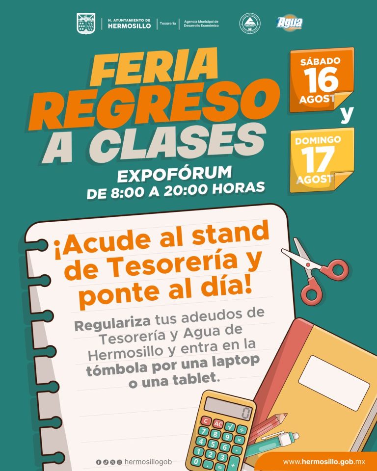 El Gobierno Municipal de Hermosillo invita a la ciudadanía al stand que Tesorería Municipal instalará en la Feria de Regreso a Clases 2025 de Canaco Hermosillo, los días 16 y 17 de agosto en las instalaciones del Expoforum.