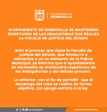 Ante el proceso que sigue la Fiscalía de Justicia del Estado, que involucra a elementos y un ex elemento de la Policía Municipal, se informa que el Ayuntamiento de Hermosillo se mantendrá respetuoso de las indagatorias y del debido proceso.