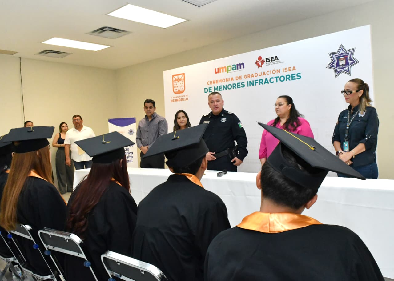Como parte de las acciones de la Unidad Municipal de Prevención y Aplicación de Medidas a Menores Infractores (UMPAM), diez jóvenes concluyeron sus estudios de nivel primaria y secundaria a través del Instituto Sonorense de Educación para los Adultos (ISEA) y recibieron sus certificados de manos del Comisario General de la Jefatura de Policía Preventiva y Tránsito Municipal de Hermosillo, Jesús Alonso Durón Montaño.