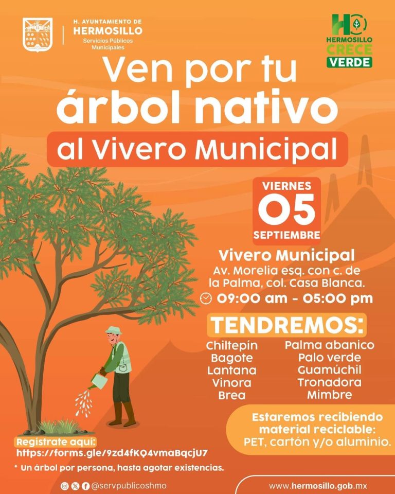 Residentes de Hermosillo tendrán, el próximo viernes 5 de septiembre, una nueva oportunidad de obtener alguno de los arbolitos nativos que se estarán obsequiando en el Vivero Municipal a cambio de materiales reciclables como plástico pet, cartón y/o aluminio, informó Amparo Fontanot.